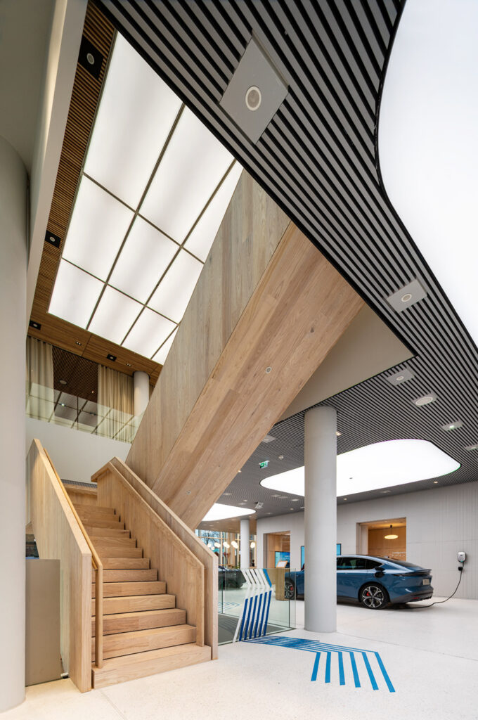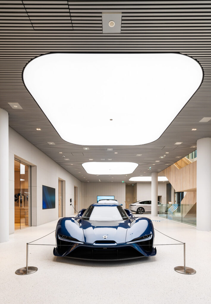 Der chinesische Elektroautohersteller Nio startete 2022 seinen erfolgreichen Einstieg in den deutschen Markt, beginnend in Berlin. Hier eröffnete Nio sein erstes Nio House in Deutschland und erschuf im UpperWest am Breitscheidplatz auf rund 1.600 m² in eine moderne Arbeitswelt mit Austellungsflächen, Cafes, Meeting Räumen, einem Kinderbereich und noch mehr. In Zusammenarbeit mit den dänischen Architekten von Schmidt Hammer Lassen und im Auftrag der Umdasch Store Makers wurde dieses anspruchsvolle Projekt innerhalb eines Jahres realisiert. Besonders innovativ war der Einsatz neuer Materialien, die in Kooperation mit Immi Beton entwickelt wurden. Die gewonnenen Erfahrungen trugen dazu bei, das Nio House in Frankfurt noch schneller fertigzustellen.